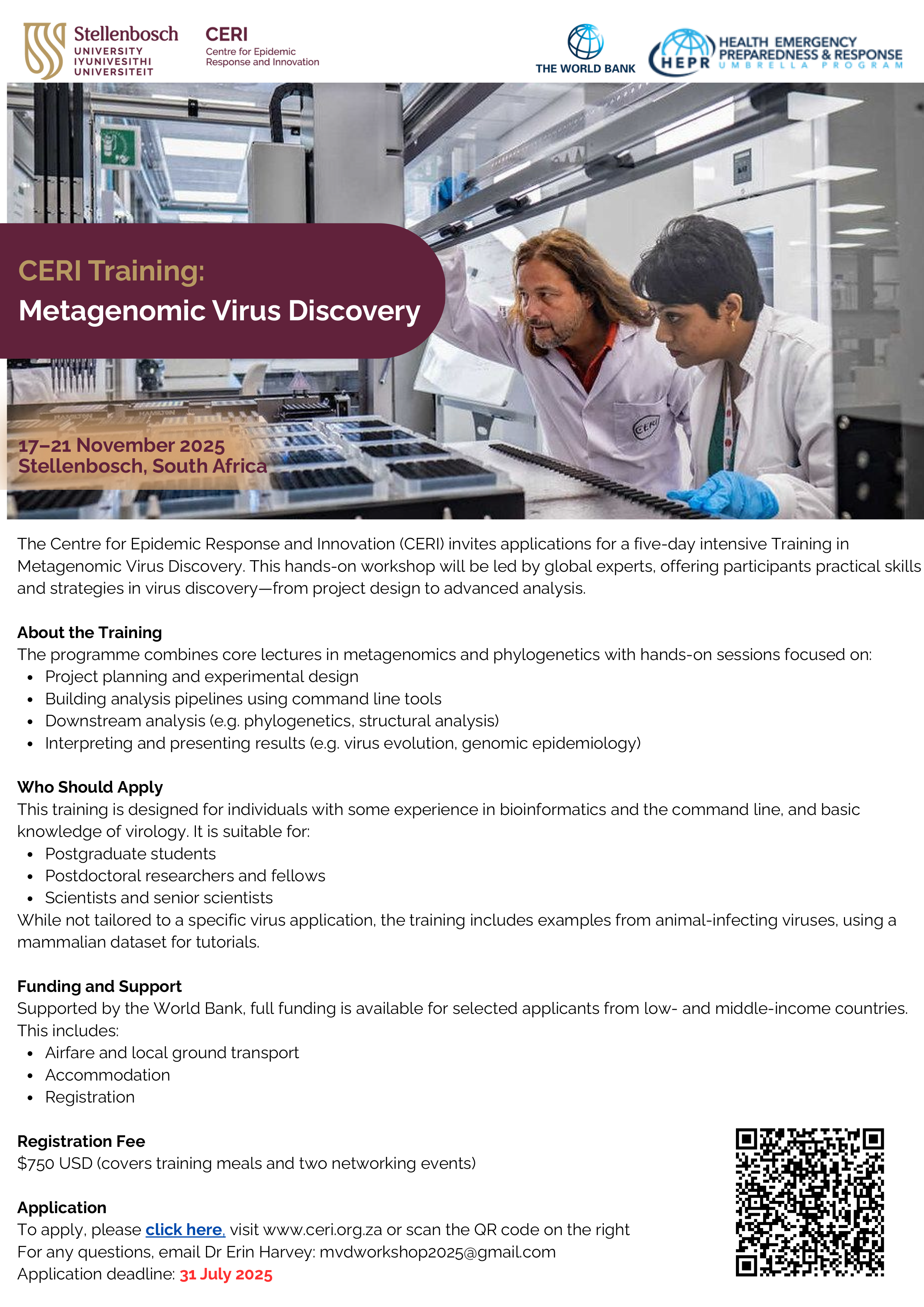 The Centre for Epidemic Response and Innovation is offering a five-day specialised hands on training workshop in metagenomic virus discovery. Experts from around the world will be coming together to offer training in effective project design, tailoring analysis pipelines for virus discovery and cutting edge down stream analysis methods.